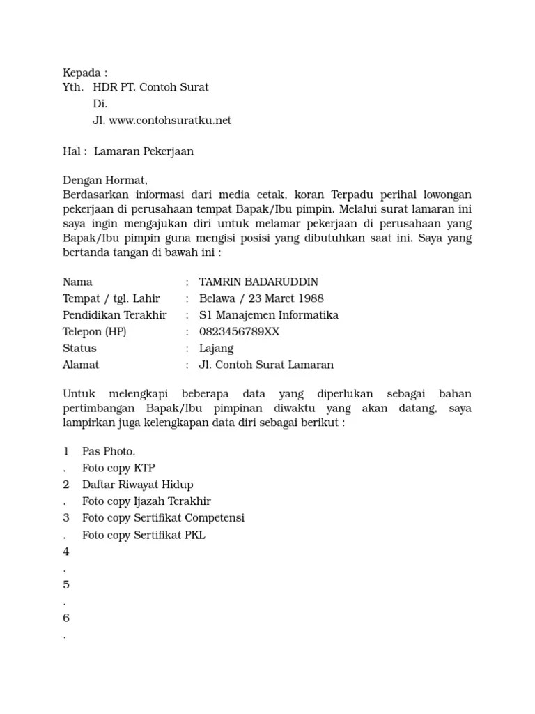Lengkap dg cara membuat surat lamaran kerja umum yang baik dan benar, print, email, . Atas perhatian yang bapak/ibu berikan, saya ucapkan banyak terima kasih. Contoh surat lamaran kerja kosong. Dengan ini saya mengajukan permohonan kerja dengan kejujuran dan siap bertanggung jawab untuk mengembangkan tenaga dan . Bagaimana contoh lamaran kerja dan email lamaran kerja yang benar?